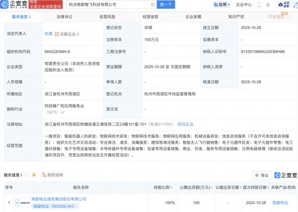 企查查APP顯示,近日,杭州南郡智飛科技有限公司成立,經(jīng)營(yíng)范圍包含:智能機(jī)器人的研發(fā);物聯(lián)網(wǎng)技術(shù)研發(fā);智能無人飛行器銷售;半導(dǎo)體器件專用設(shè)備銷售等。企查查股權(quán)穿透顯示,該公司由南都物業(yè)(603506)全資持股。